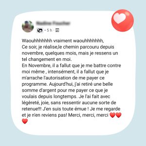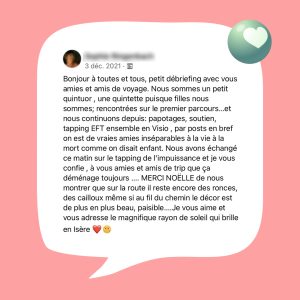 Pour Maria, la libération passe par des approches concrètes, notamment l’EFT, la sophrologie, la thérapie provocatrice mais aussi l’écoute, le chant du cœur, l’humour – et le chocolat, le cas échéant ;)